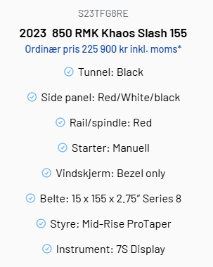 Pent brukt Polaris Overligger 2023 850 RMK Khaos Slash 155 gått 53 Km Første gangs registrert i 2026. Kom innom for en hyggelig handel eller kontakt Arild på telefon 91774300 mail arild@bondal.no